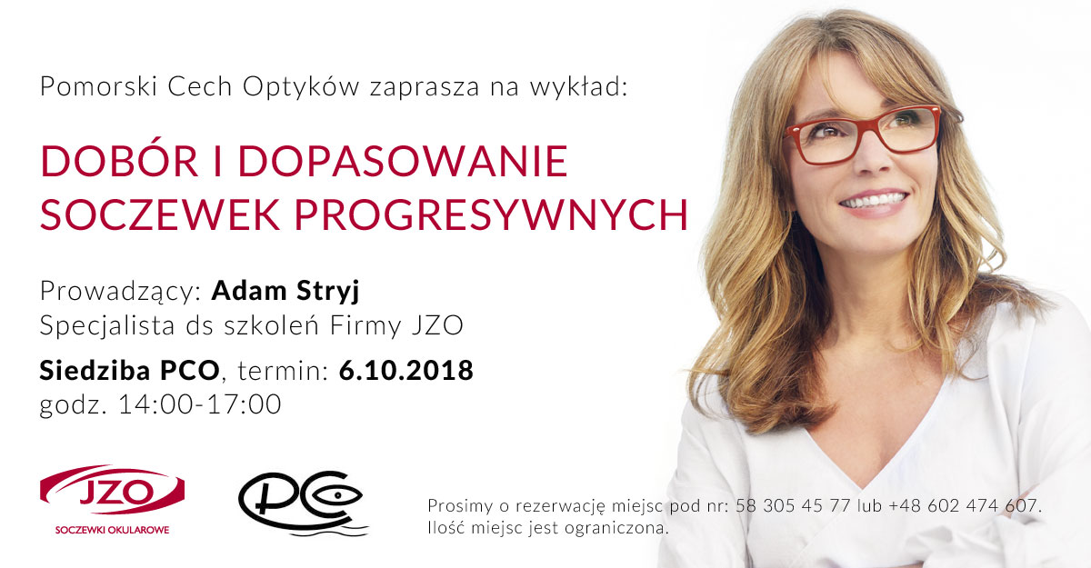 Zarząd Pomorskiego Cechu Optyków wraz z JZO S.A. zapraszają na wykład: „Dobór i dopasowanie soczewek progresywnych”, który odbędzie się 6 października 2018 r. ( sobota ) w Gdańsku, w siedzibie Pomorskiej Izby Rzemieślniczej Małych i Średnich Przedsiębiorstw przy ul. Piwnej 1/2 , sala 215 B, w godzinach 14:00 – 17:00. Wykład poprowadzi specjalista ds. szkoleń JZO S.A.…