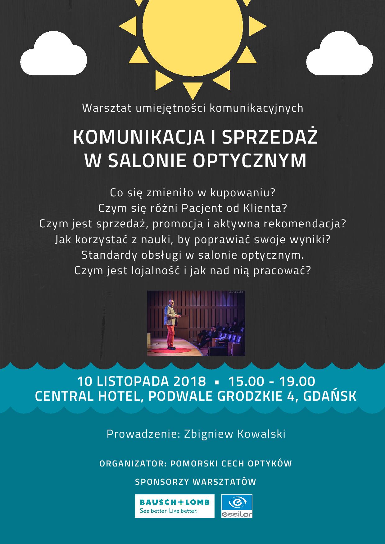 Zarząd Pomorskiego Cechu Optyków w Gdańsku wraz ze sponsorami : Bausch + Lomb oraz Essilor Polonia sp. z o.o mają zaszczyt zaprosić Państwa oraz Państwa pracowników na warsztaty: „Komunikacja i sprzedaż w salonie optycznym” które odbędą się w Gdańsku w dniu 10 listopada 2018 r. ( sobota ) w godzinach 15.00 – 19.00 w Central Hotel ul. Podwale Grodzkie 4.…