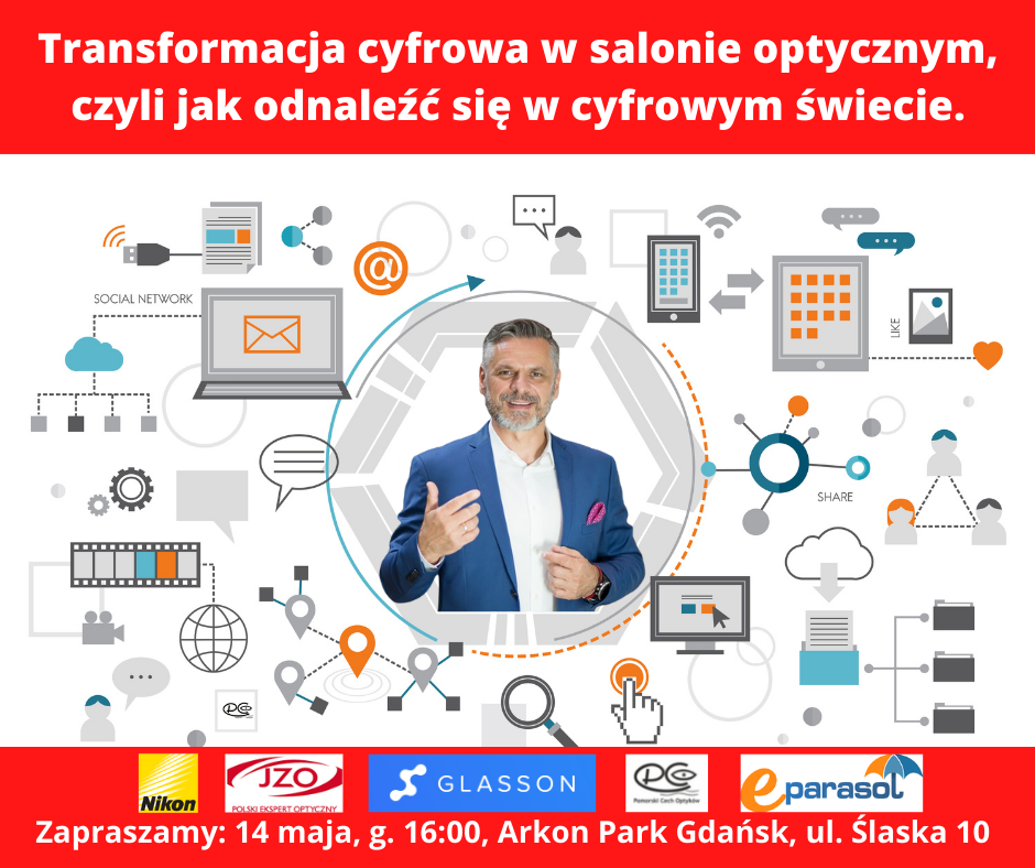 Już 14 maja o godzinie 16.00 Pomorski Cech Optyków wraz z marką NIKON , firmą E-Parasol Ubezpieczenia Sp. z o.o. oraz firmą dostarczającą program do obsługi salonów optycznych, gabinetów - Glasson - zapraszają serdecznie do Hotelu Arkon Park Gdańsk na wyjątkowy wykład Pana Marka Wikiery „Transformacja cyfrowa w salonie optycznym, czyli…